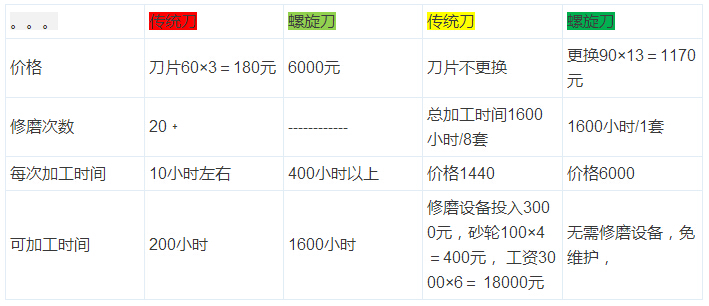 綜上結論傳統刀具每小時14.27元,螺旋刀具每小時3.75元,還沒算上節約的電量,螺旋刀切削阻力值是傳統刀具1/3可節約電量30%大大降低生產成本,六個月后螺旋刀片可拆下來修磨成本還可以大幅度下降。